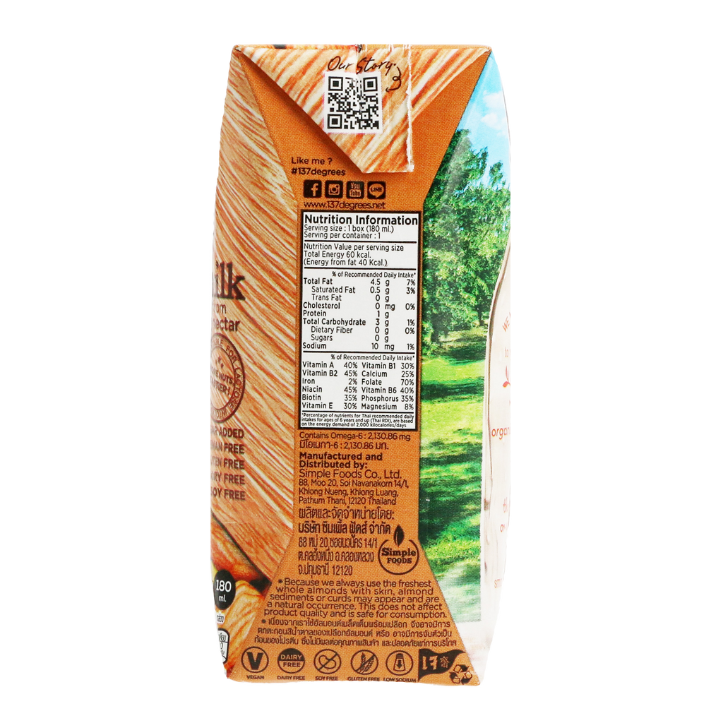 Almond milk freshly squeezed from 100 percent Californian non-GMO whole almonds. No cane sugar, carrageenan, preservative or nasty chemicals added. High in Vitamin B, Folic Acid and Calcium. Zero Trans fat and zero cholesterol. Lightly sweetened with low GI organic coconut flower nectar. only 70 calories.