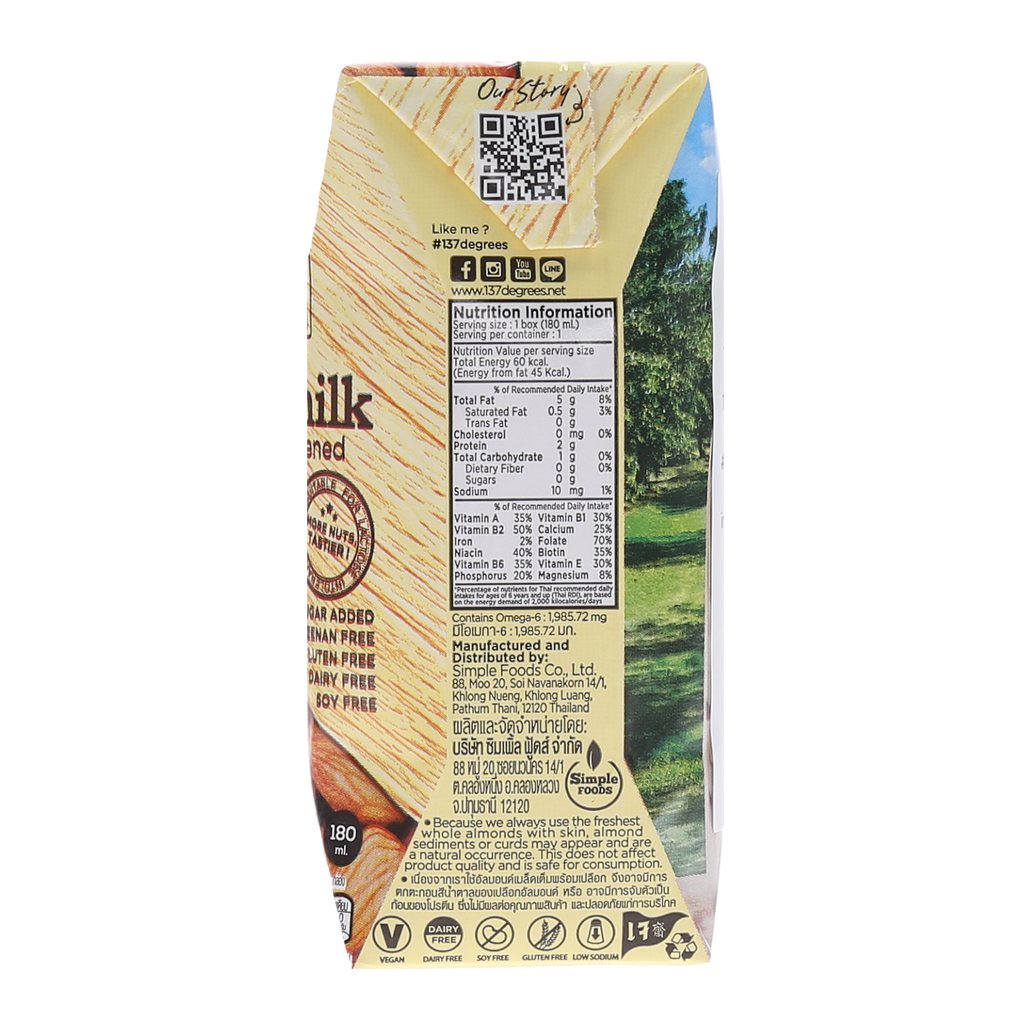Almond milk freshly squeezed from 100 percent Californian non-GMO whole almonds. No cane sugar, carrageenan, preservative or nasty chemicals added. High in Vitamin B, Folic Acid and Calcium. Zero Trans fat and zero cholesterol. Naturally creamy and nutty. Only 60 calories.