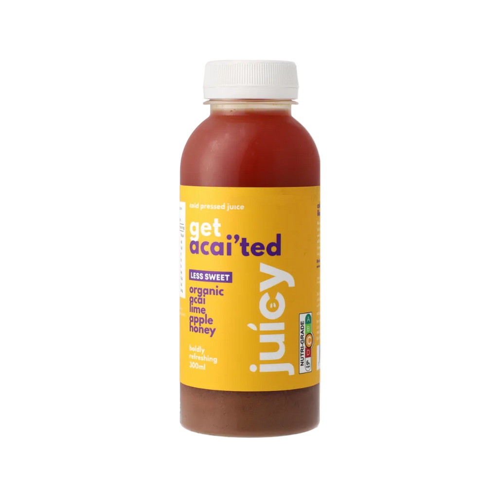 Juicy – Get Acai’ted is a refreshing, antioxidant-rich cold-pressed juice crafted for those who love a clean, fruity boost. Blended with Cloudy Apple Juice (49%), Acai Purée (5%), fresh Lime Juice, natural Honey (4%), and purified Water (42%), this vibrant mix delivers a perfectly balanced taste lightly sweet, subtly tangy, and deeply satisfying.