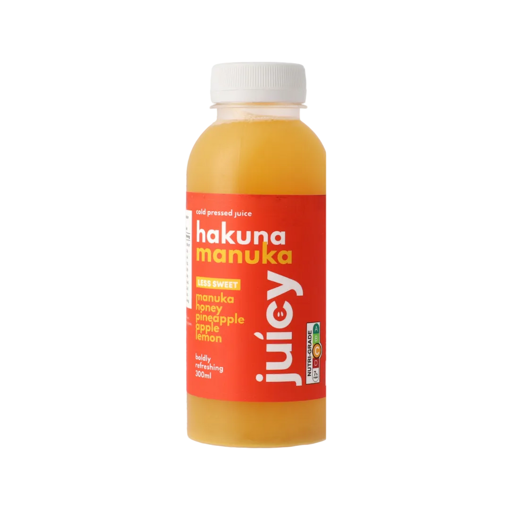 Juicy – Hakuna Manuka is a tropical, feel-good cold-pressed juice crafted for smooth, natural refreshment. Made with Cloudy Apple Juice (43%), Pineapple Juice (10%), premium Manuka Honey, natural Honey (3%), a splash of Lemon Juice, and purified Water (44%), this uplifting blend delivers a bright, juicy sweetness with a gently soothing finish.